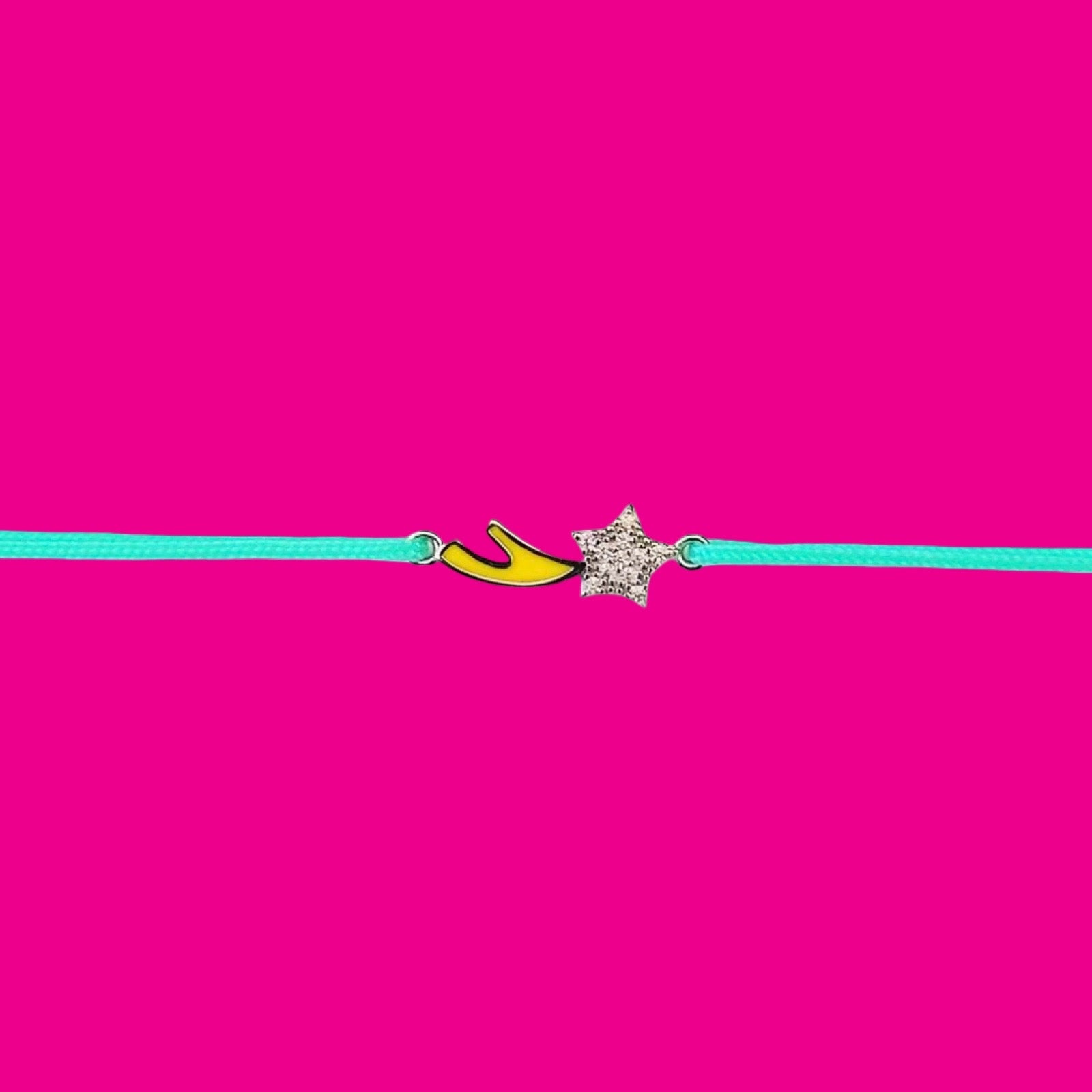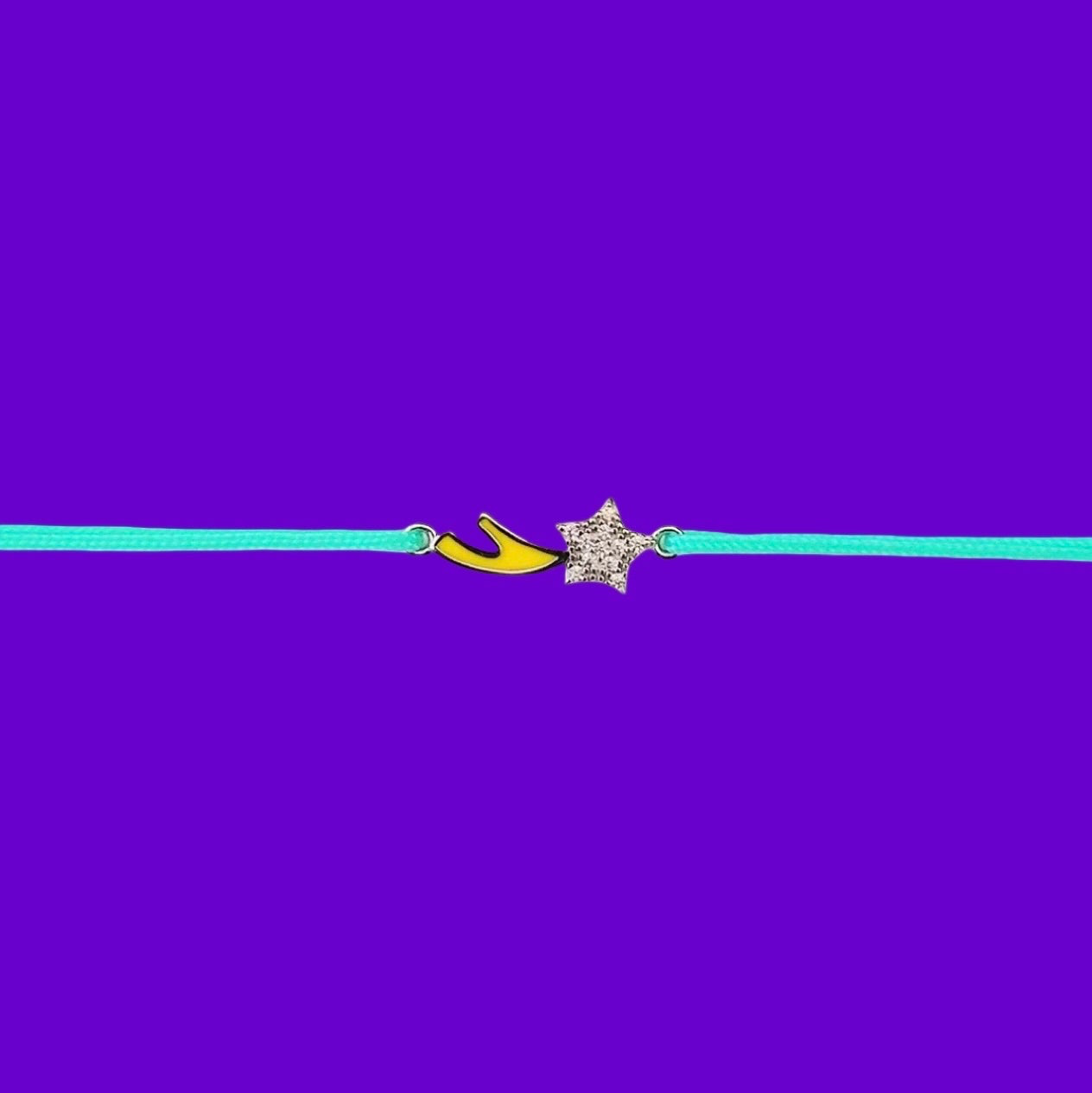 Bracelet "Etoile lumineuse"  jaune en argent monté sur cordon vert eau.